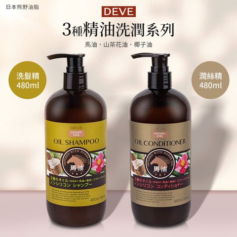 【日本熊野油脂】DEVE 3種天然精油洗髮精/潤絲精 480ml(馬油.山茶花油.椰子油)